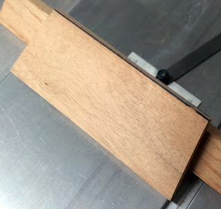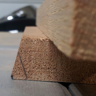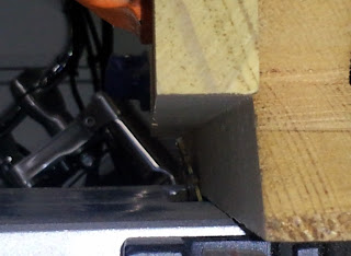 Before I ran the practice piece through the saw, I drew a line on the bottom edge so I could see how much of this edge was lost to the saw. The goal was to have the saw just miss the bottom edge of the practice part. When I ran the part through the saw, the angle was cut perfectly and the black line on the bottom edge was still there.