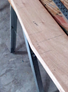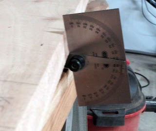Because frame 0 (the transom) is slanted 12 degrees back from vertical, the bottom edge of the transom has to be cut at an angle. I described this in a previous post. This angle needs to be cut at 12 degrees.