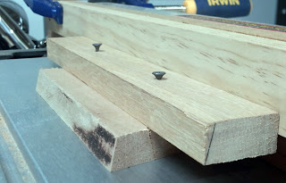 The next step was to clamp two pieces of narrow wood to the fence on the table saw. One piece rested against the fence and on the table. The other was about ¼ inch above the height of the blade. The fence was then pushed up against the blade with the top of the blade angled away.