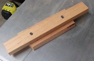 In order to cut off the correct amount of my part, I need to control the depth it can be pushed under the second piece of wood attached to the fence. So I attached a piece of wood to a sample piece at approximately ⅝ inch using drywall screws. This piece of wood will press up against the second piece of wood on the fence and control the depth of the cut on the part.