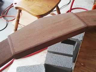 This frame required more work dressing gussets than frame 6 for two reasons. There are two extra gussets to deal with and I had to dress up both sides of the frame. The veneers were completed last week as well as several of the gusset end caps. I completed the remaining end caps on Sunday. Here are photos of the completed gussets. They have not been coated with epoxy yet.